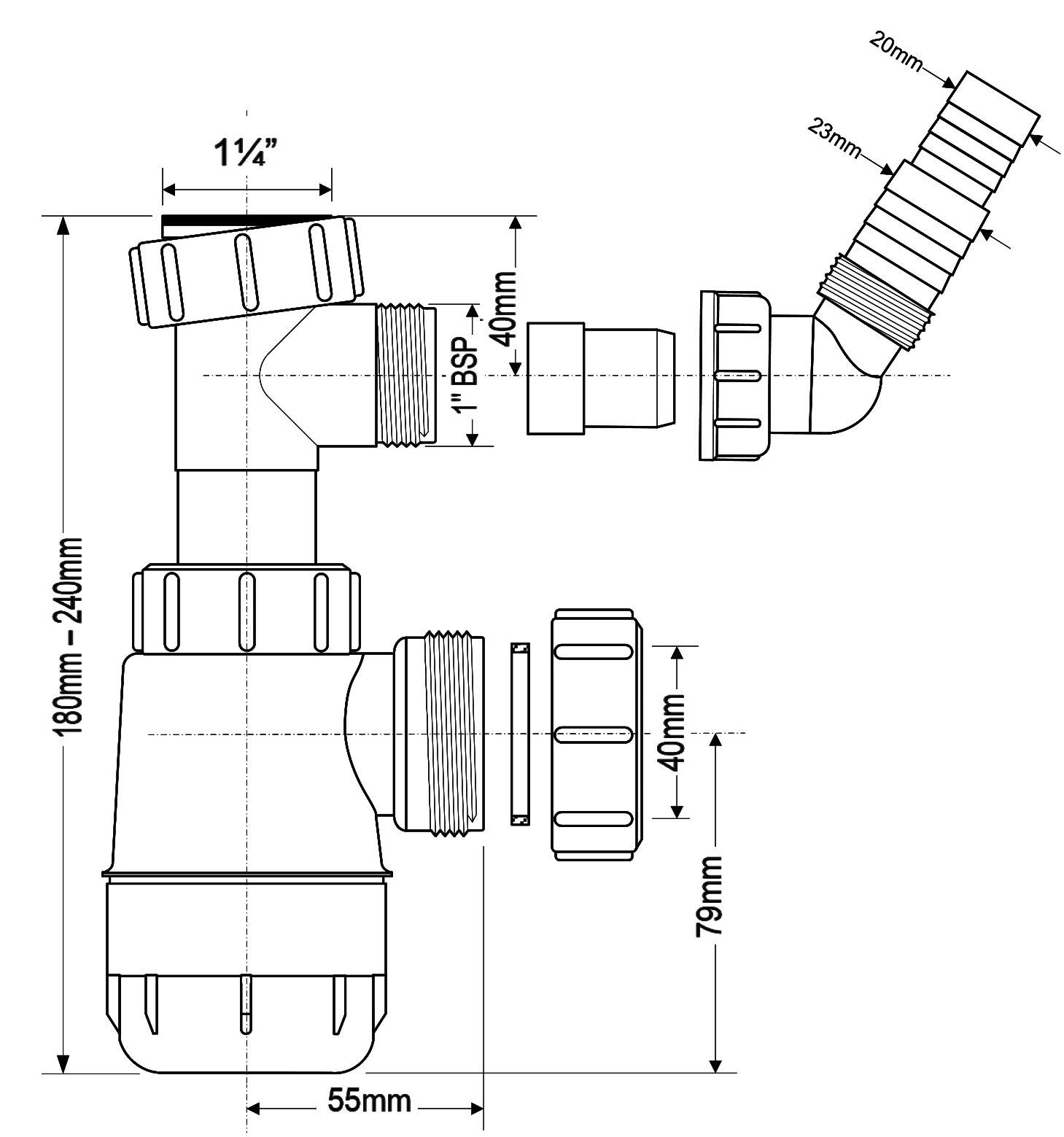 MRW240NW-WM Սիֆոն շշաձև (1 1/4x32մմ) առանց խցան, ադապտեր Ду40մմ սպիտակ McALPINE